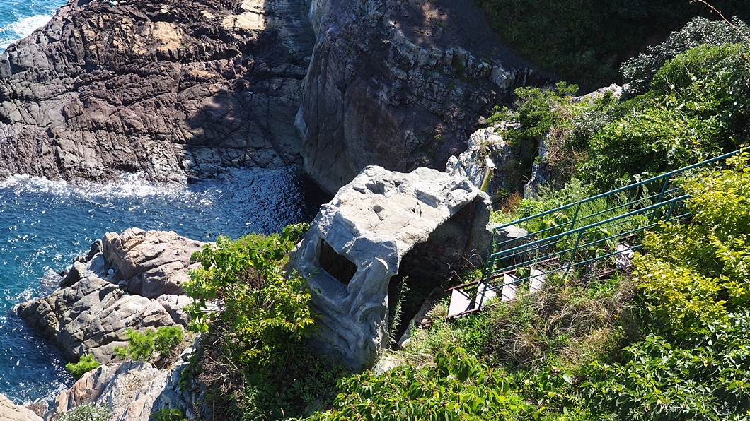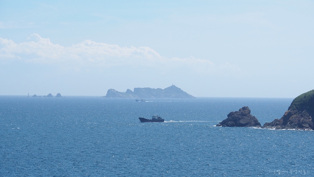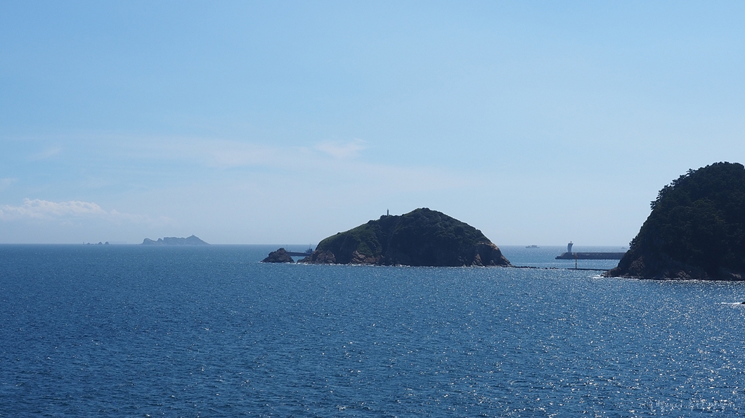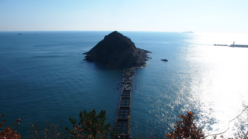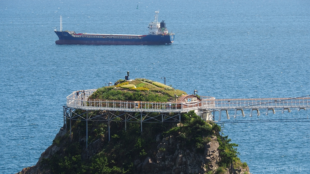 용궁 구름다리 건너 동섬 위에서 보이는 바다와 영도 풍경