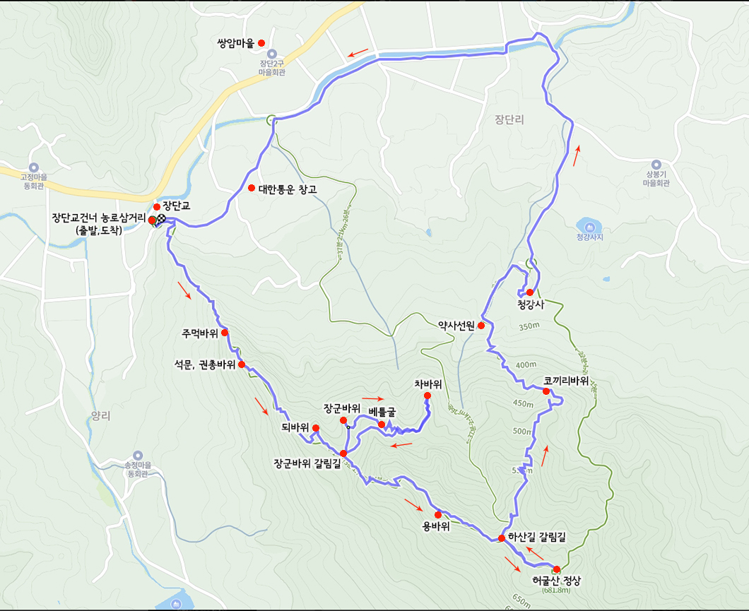 장단교 건너 농로삼거리 주차 - 주먹바위 - 권총바위 - 되바위 - 장군바위 - 베틀굴 - 차바위 - (되돌아 나와서) - 용바위 - 정상 - 코끼리바위 - 청강사 - 임도 - 농로 (원점회귀)