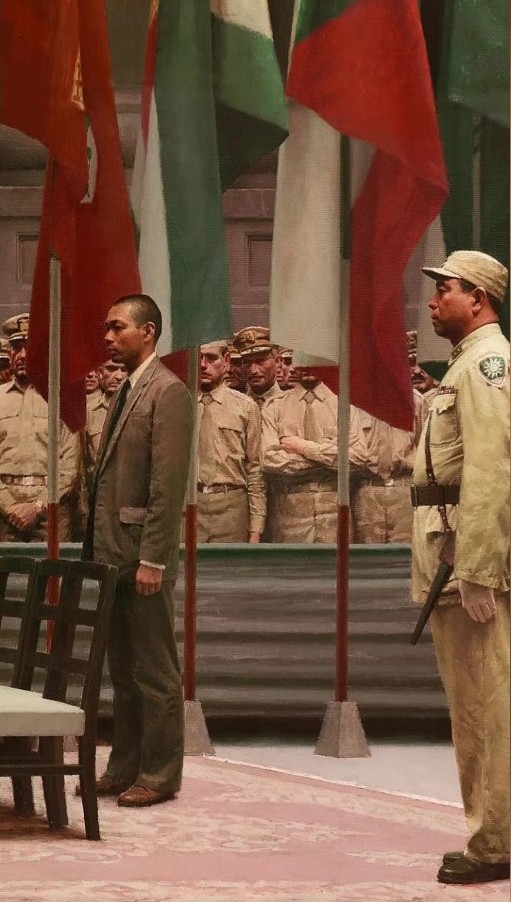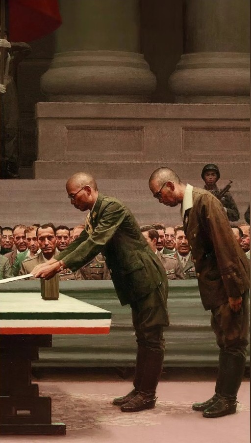 그림에는 52개 유엔 회원국의 국기로 둘러싸인 260명이 넘는 인물들이 등장하는 웅장한 구도로 그려져 있는데 작가는 일본 장군의 깃 휘장, 소맷단, 군화, 박차, 항복 매트의 삼색 천(중화민국기를 상징하는 청, 백, 적) 등 역사적 세부 사항을 실제 내용을 토대로 그렸답니다.
