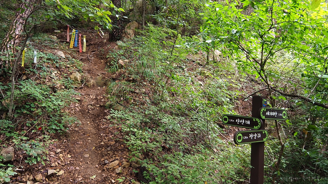 좌측 숨은골로 올라서 신선대를 거쳐 하산하는 것과 신선대를 먼저 올라 정상을 거쳐 숨은골로 하산하는 것은 취향에 따라 달라지는데 하산하는 숨은골은 거의 너덜지역이라 체력에 조금 자신이 없는 분은 숨은골로 오르는 것이 더 낫겠네요.