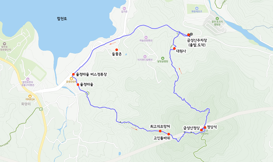 산행 코스 : 금성산주차장 - 도로를 따라 걸어서 - 율정마을 - 암릉구간 - 고인돌바위 - 정상 - 대원사 - 주차장(원점회귀)
