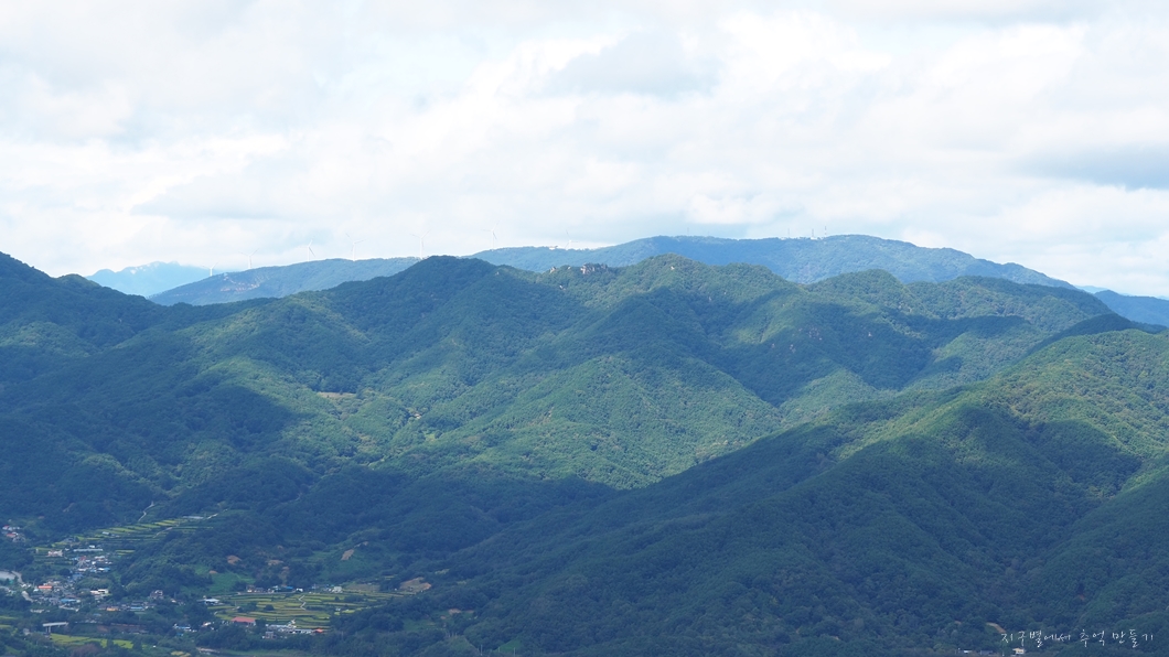 좌측 중앙에 희미하게 뾰쪽한 산이 박유산. 그 뒤로 암릉이 살짝 보이는 보해산. 그 뒤로는 양각산 수도산에서 가야산으로 이어지는 수도~가야 능선이네요.