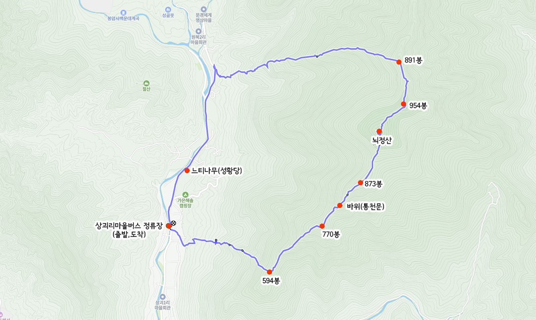 상괴리마을 도로가에 있는 버스 정류장에서 출발하여 반시계 방향으로 한 바퀴 돌았네요.