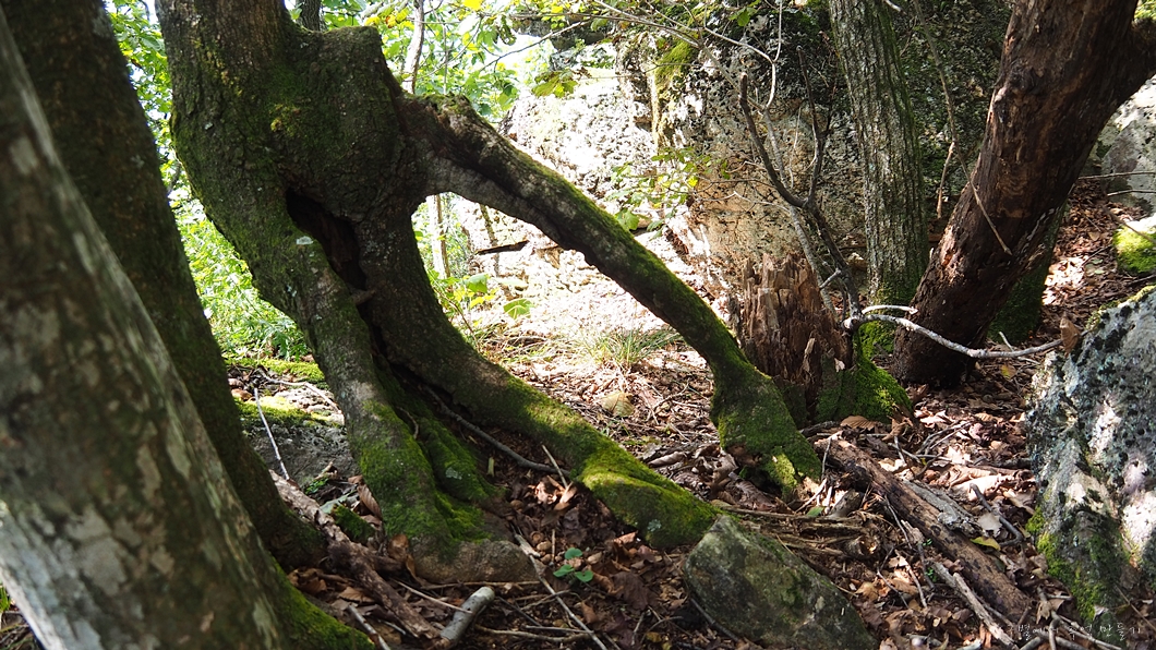 자빠져 있는 나무가 죽지 않고 살아서 가지들이 모두 하늘로 솟아 있네요.