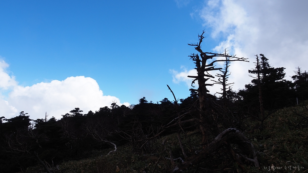 잠시 하늘이 열려 고사목에 햇살이 반짝하고 비칩니다.