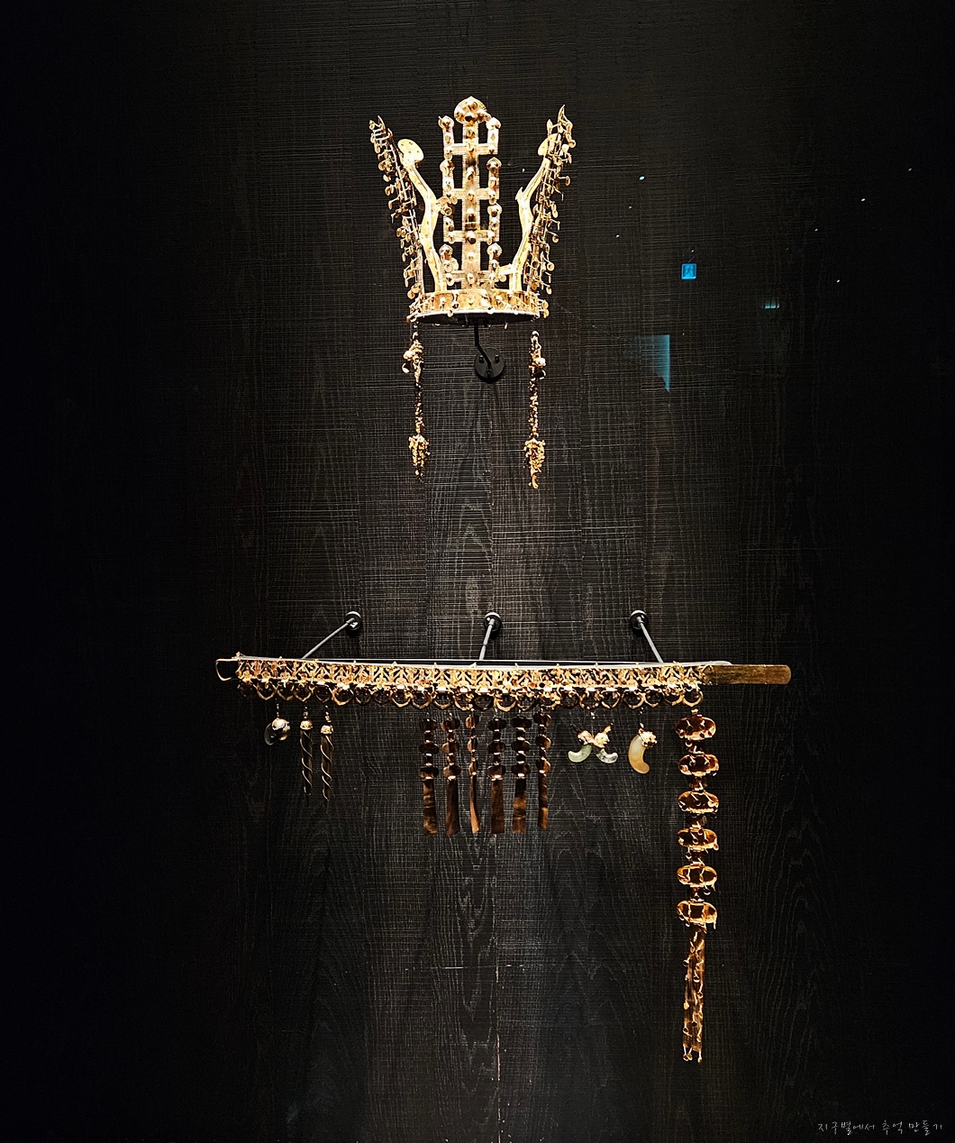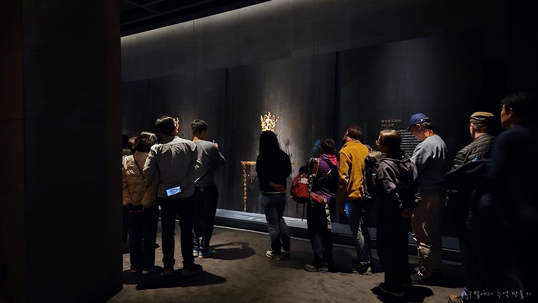 이 금관은 전시관 복판에 전시되어 있는데 성인 평균 키 높이에 맞춰 전시되어 유리관 뒤편에서 금관을 쓰고있는 형태의 인증 사진을 찍을 수 있게끔 해 둔 것이네요.