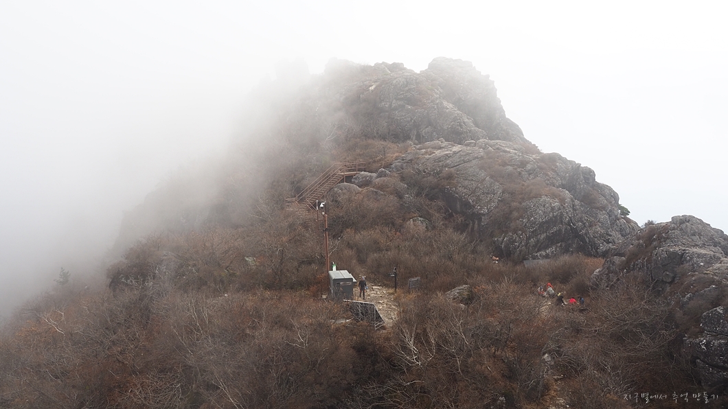 정상에서 날씨가 걷히기를 한참이나 기다려도 안개 왔다 갔다 하여 하산을 하는데 내려오니 안개가 말끔 걷히고 있네요.ㅠㅠ