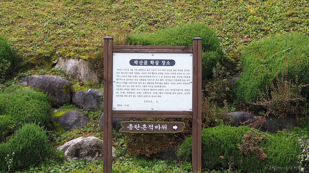 인민군 부역자로 몰려 아무죄도 없는 시골 벽촌 동네사람들이 어린아이 포함하여 모조리 우리 군인들에 의하여 총살당한 곳입니다.