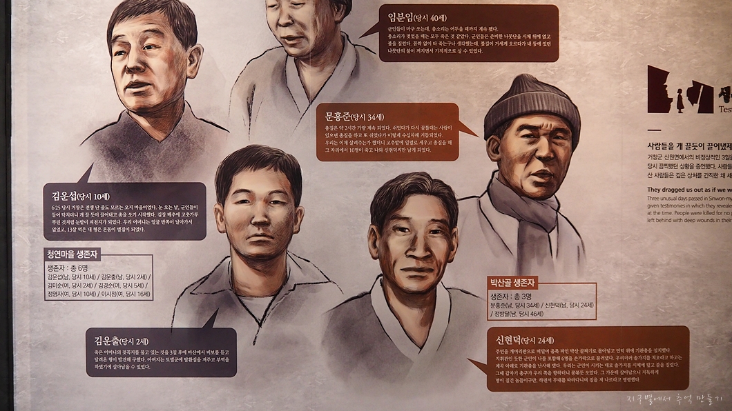 1951년 2월 9일 일부 국군이 처음으로 주민들을 집단학살한 청연마을에서는 이곳에서 84명의 마을주민들이 숨졌는데, 김운섭(남·9세), 김운출(남·2세), 정영자(여·10세), 김미순(여·2세), 김경순(여·4세) 등 다섯 명이 기적같이 살았고 2월 11일에는 박산골에서 517명이 학살되었는데 문홍준(남32세), 정방달(남46세), 신현덕(남23세) 세명이 기적처럼 살아남았답니다.