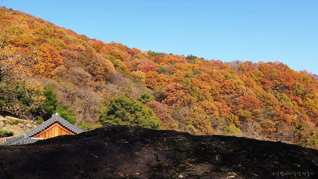 암자 뒤편에 감나무 두 그루에는 발갛게 익은 감들이 가득 달려있네요.