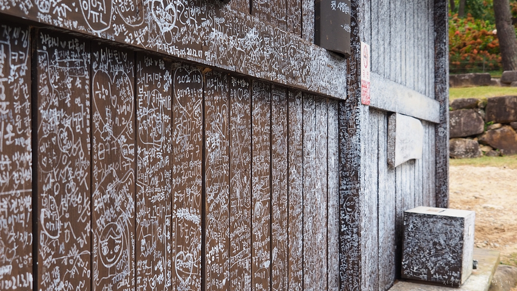 이전에 기와불사 신청을 하는 장소 같은데 화이트펜으로 쓴 방명록(?)이 하나의 작품이 되었습니다.