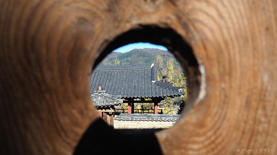 중정당 강당의 뒤편 문의 옹이구멍에서 본 풍경.