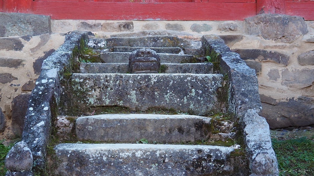 자세히 보면 사당으로 오르는 계단 바닥에도 꽃이 한송이 조각이 되어 있고 계단 상단에는 역시 이빨을 드러내고 코를 내밀고 있는 짐승의 머리가 보이는데 뭔 짐승인지는 모르겠습니다.