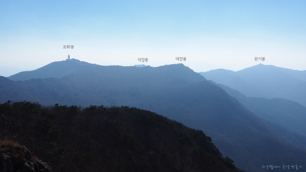 앞쪽으로 대견봉과 조화봉, 그리고 우측으로 관기봉이 살짝 보이네요.