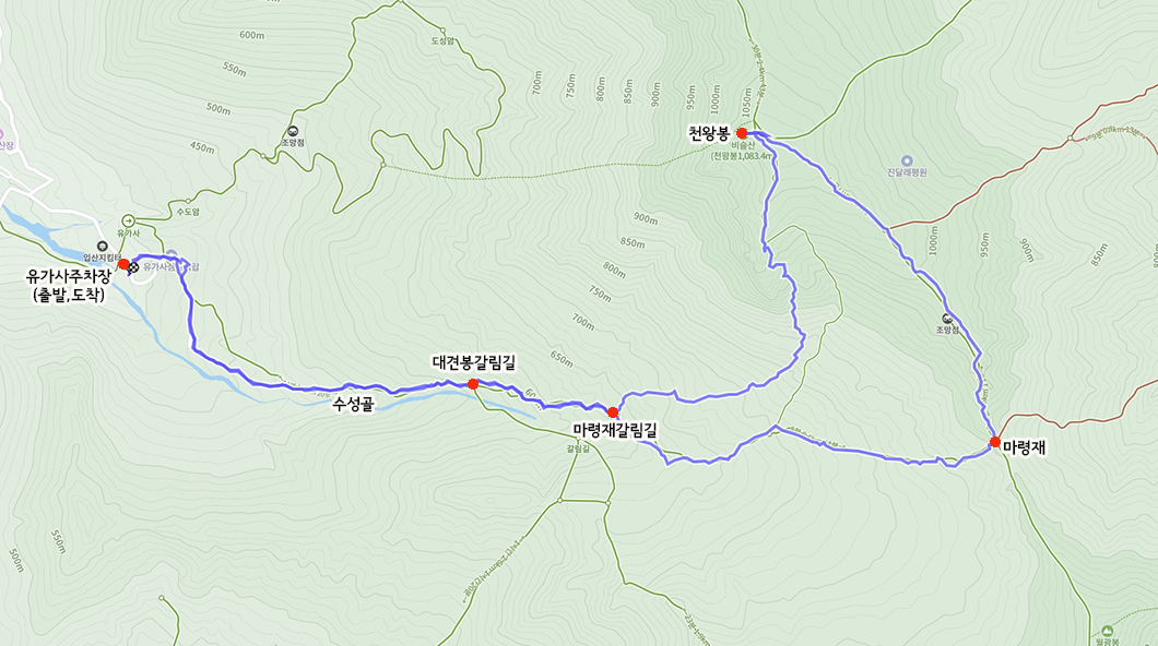 산행 코스 : 유가사주차장 - 수성골 - 정상 - 마령재 - 수성골 - 유가사(원점회귀)