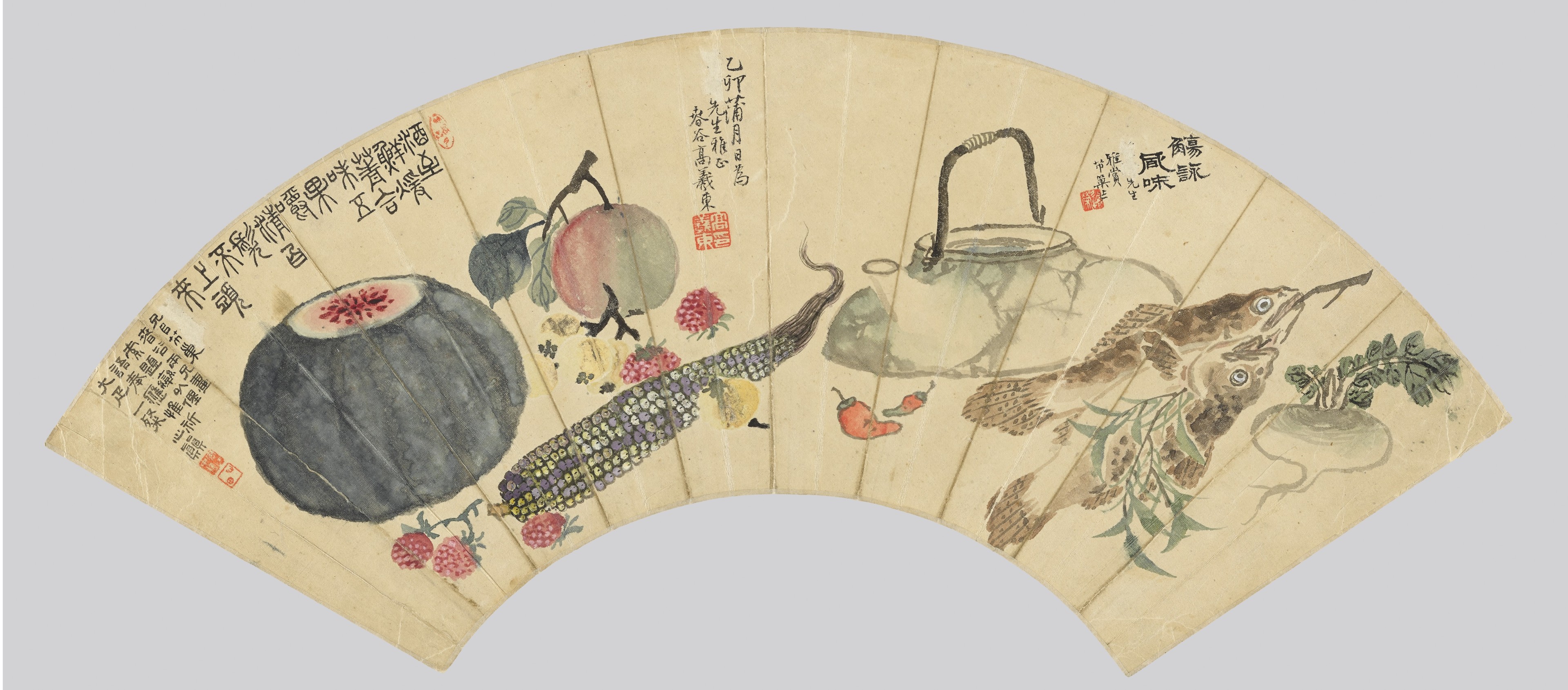 1915년 5월에 두 사람의 합작으로 그린 이 부채 그림은 근대 화단의 주요 작가 세 명의 손길이 함께한 작품입니다.