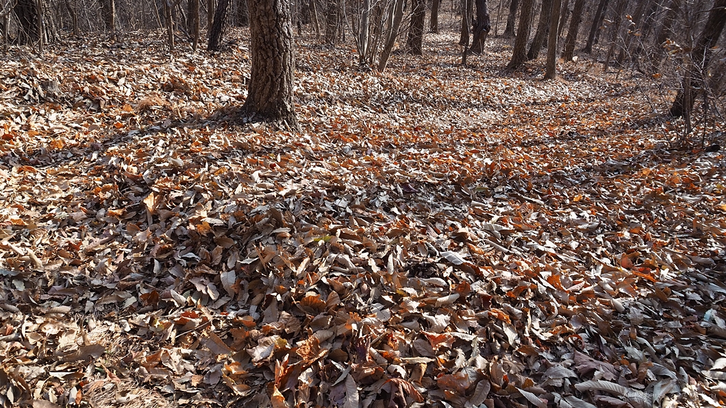 눈길보다 100배 정도 더 미끄러운 낙엽 하산길.