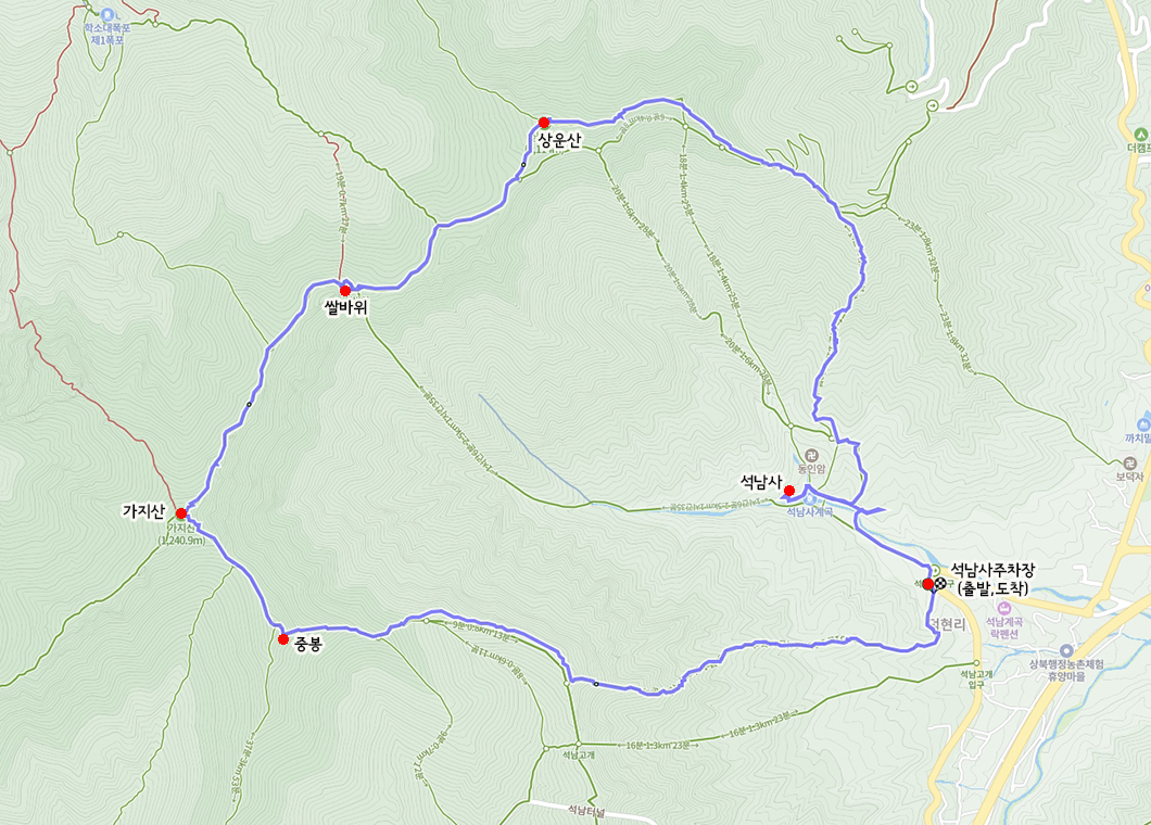 산행 코스 : 석남사 주차장 - 능선 - 중봉 - 가지산 정상 - 쌀바위 - 상운산 정상 - 석남사 - 주차장(원점회귀)