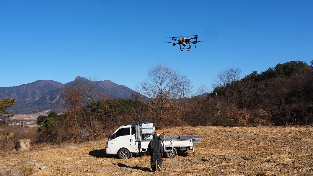 군청에서 나와 드론으로 조류 AI 방제약을 드론으로 작업하고 있습니다.