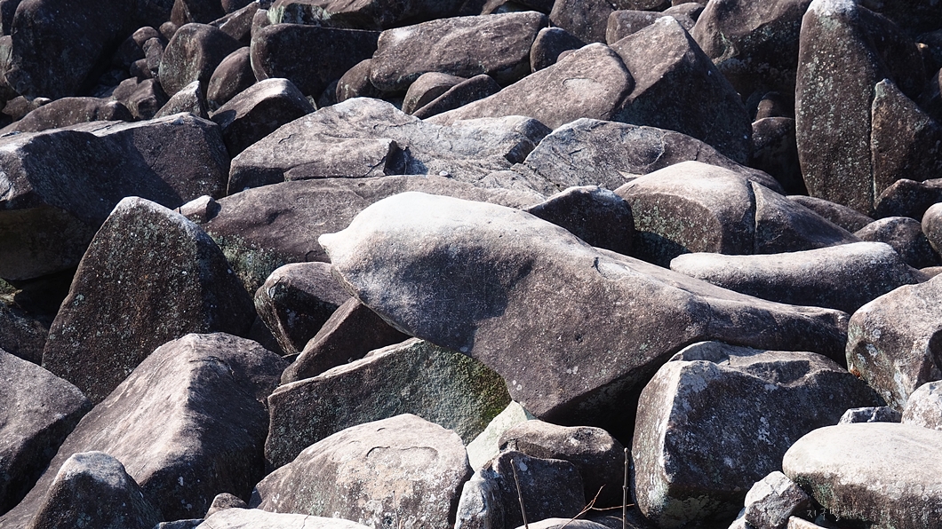 바위 위가 하얗게 보이는 곳은 두드린 자국.