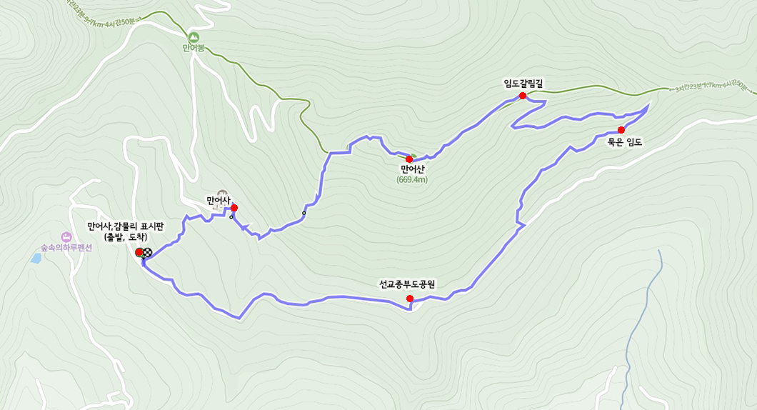 산행 코스 : 감물리 갈림길 주차 - 만어사 - 산길로 정상 - 구천산 방향 능선길 - 묵은 임도 따라 하산(원점회귀)