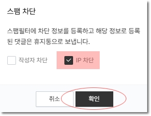 4. 작성자 차단란에는 체크를 해제하고(이건 동명의 이름이 많으므로) IP차단에만 체크를 합니다.