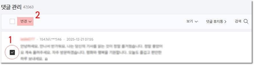 2. 차단해야 할 댓글 앞 창에 체크를 하고 변경을 클릭합니다.
