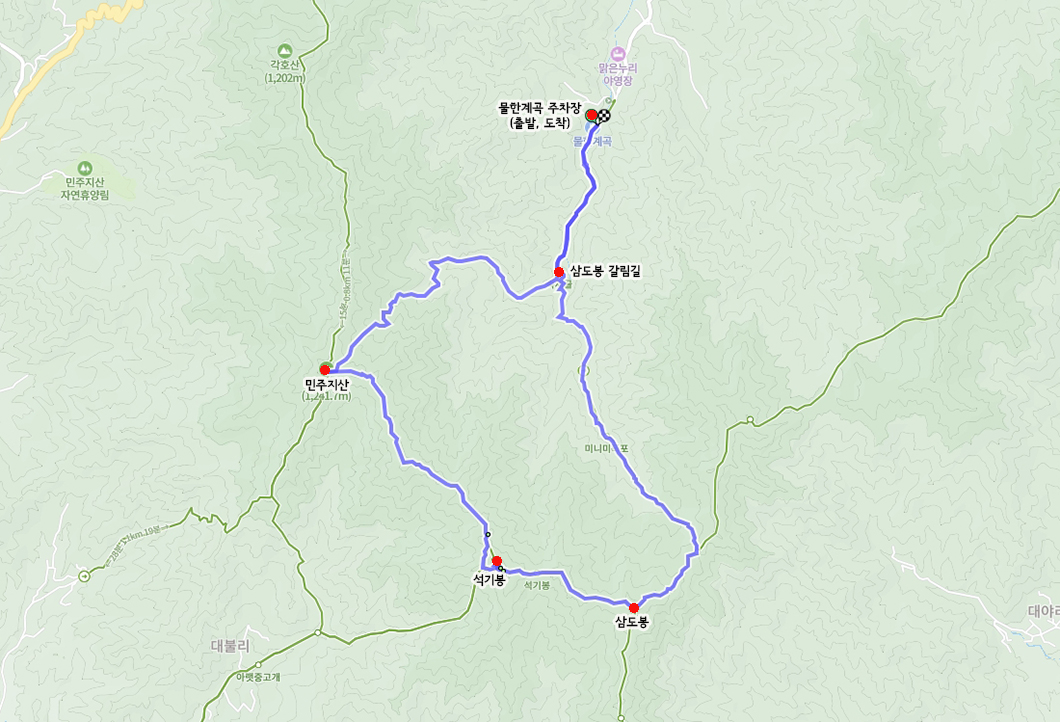 산행 코스 : 물한계곡 주차장 - 민주지산 - 석기봉 - 삼도봉 - 주차장(원점회귀)