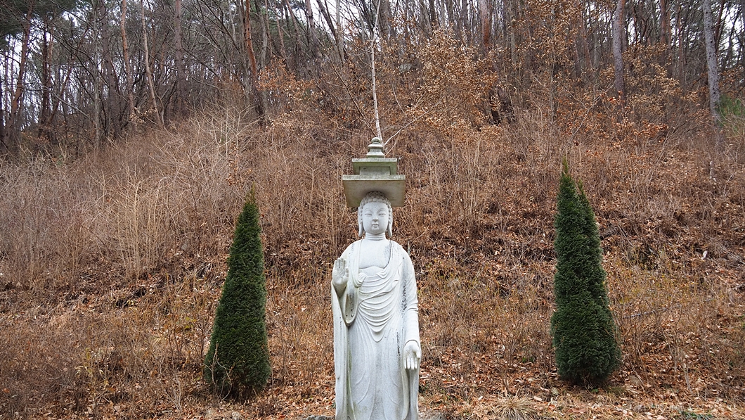 마당 한켠에 서 있는 저 보살님은 뭔 업보가 있길래 저 무거운 관을 쓰고 있을까요?