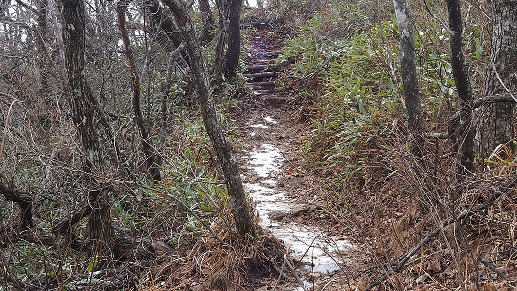 능선길 곳곳 도사린 빙판길이 암초입니다.