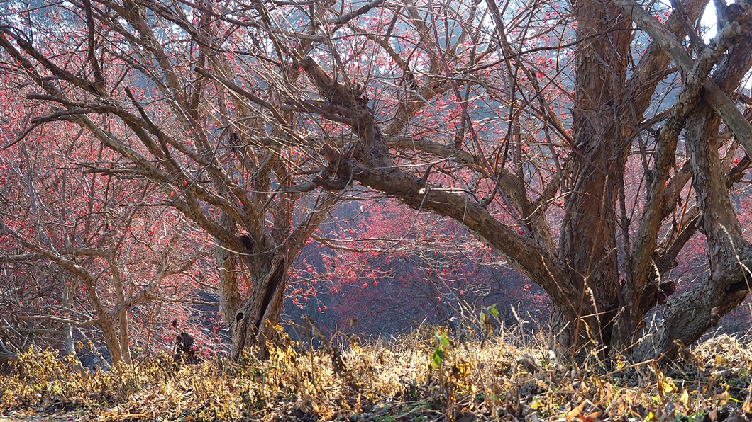 산수유 열매가 수확을 하지 못하고 그대로 달려 있는 게 반 이상입니다.