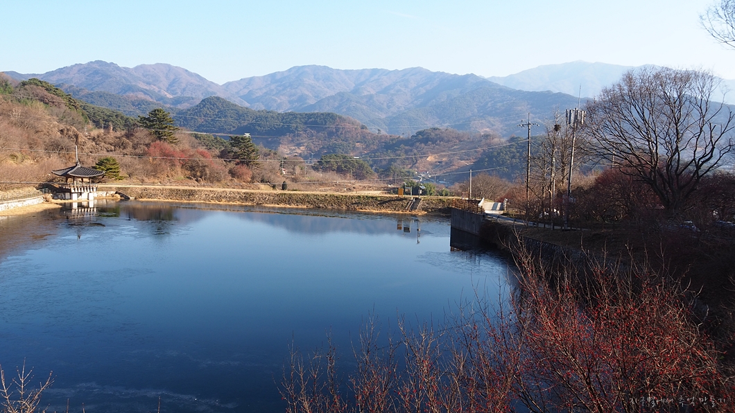 현천저수지 앞에 바알간 산수유 열매가 달려 있고 머얼리 지리산 능선이 올려다 보입니다.