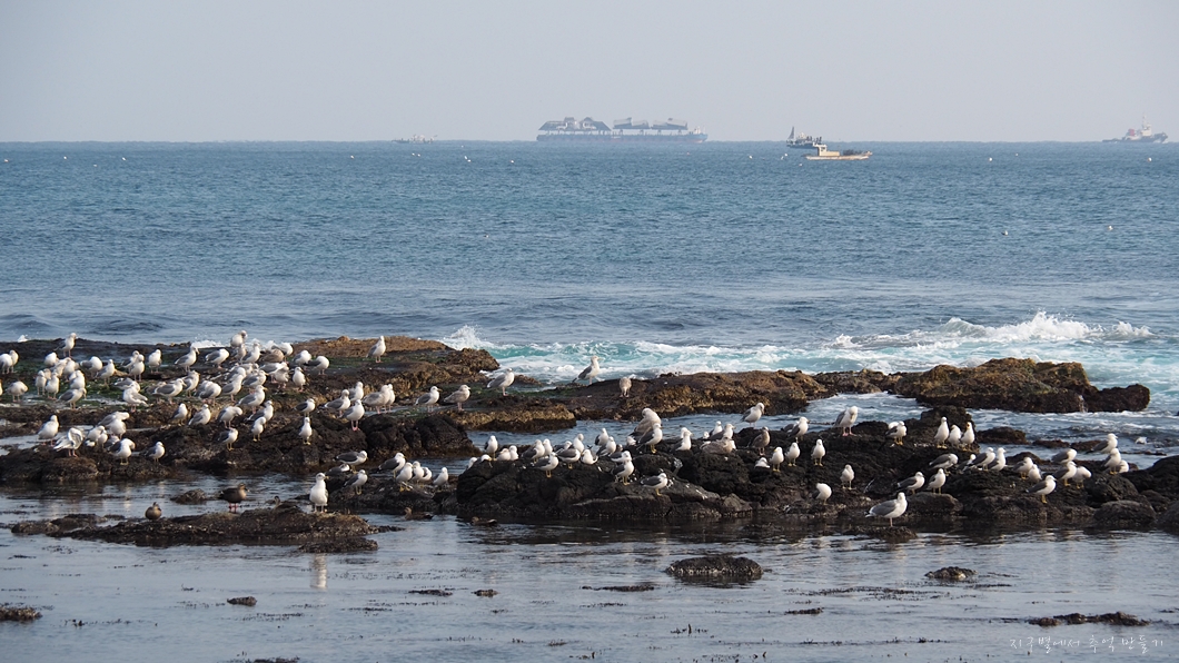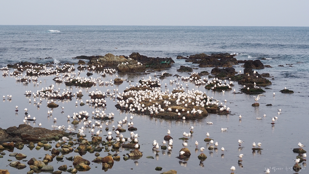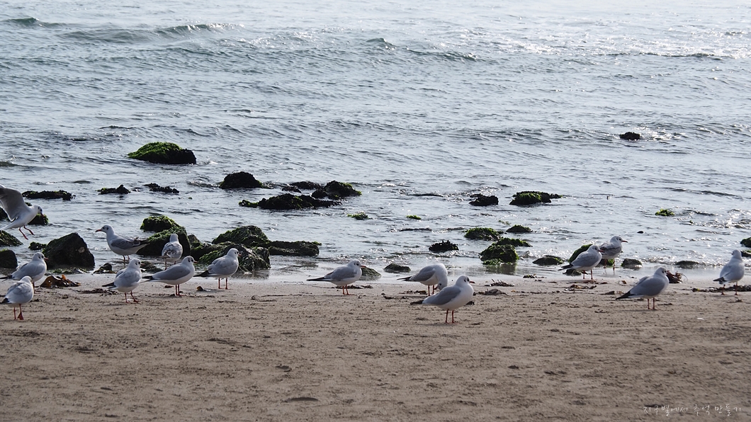 갈매기들이 모두 바닷가에 쉬고 있네요.