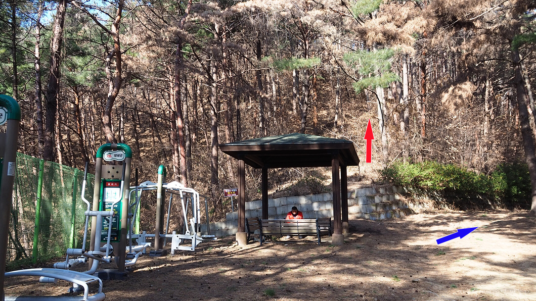 이곳 삼거리에서 우측 길(파란색)이 보이지만 너무 넓은 임도길이라 직진 방향(빨간색) 산길로 올라갔습니다.