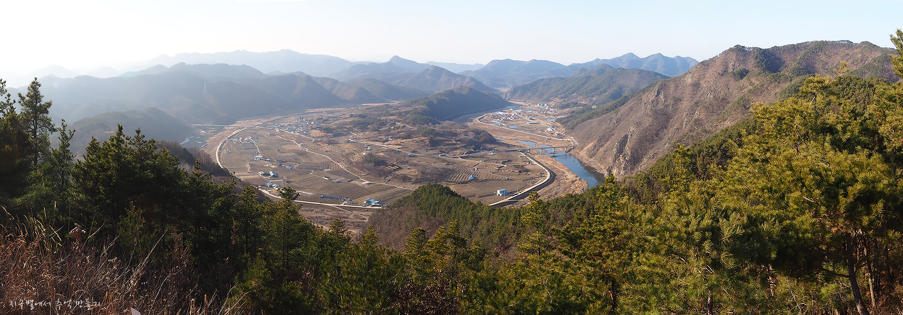 좌측 앞이 내도리의 물돌이 마을이고 그 뒤로 중앙 멀리 충남의 산들이 보이는데 눈짐작으로는 가늠하기가 쉽지 않습니다.