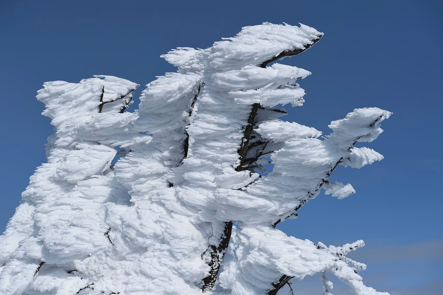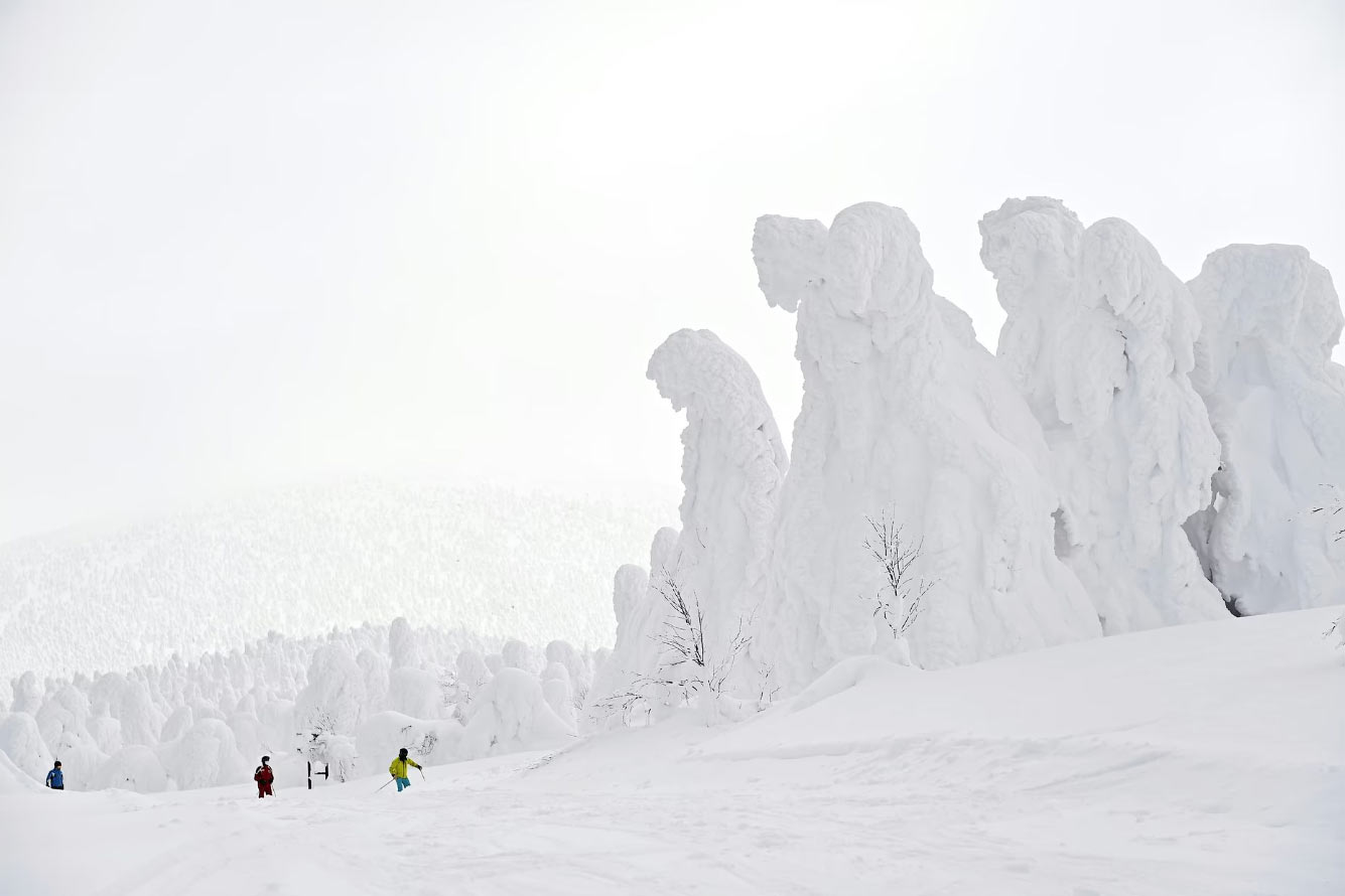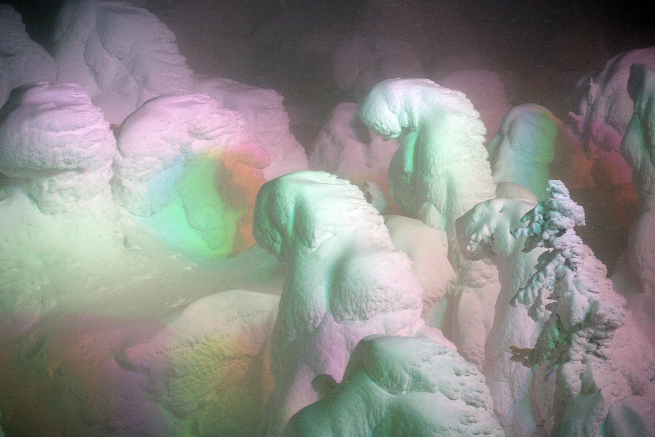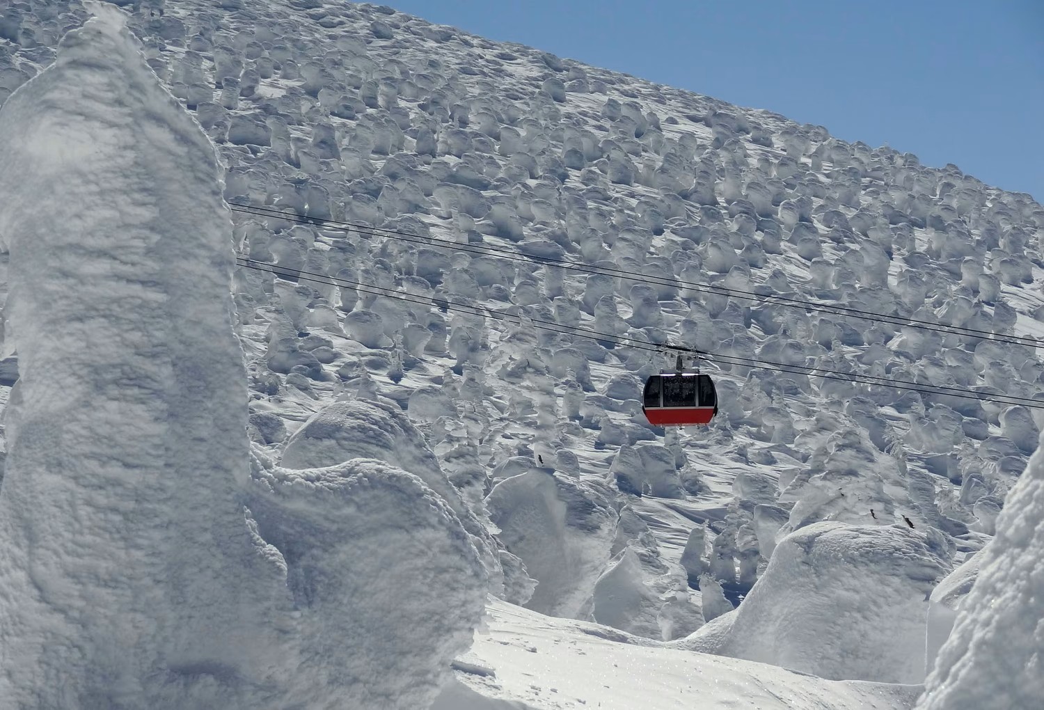 호수 위로 부는 강한 바람이 물방울을 나무와 가지에 떨어뜨려 얼게 하고 거의 수평에 가까운 고드름이 형성되는데 이 모양이 기괴하게 보여 설괴물(スノーモンスター)이라는 이름으로 불리네요.
