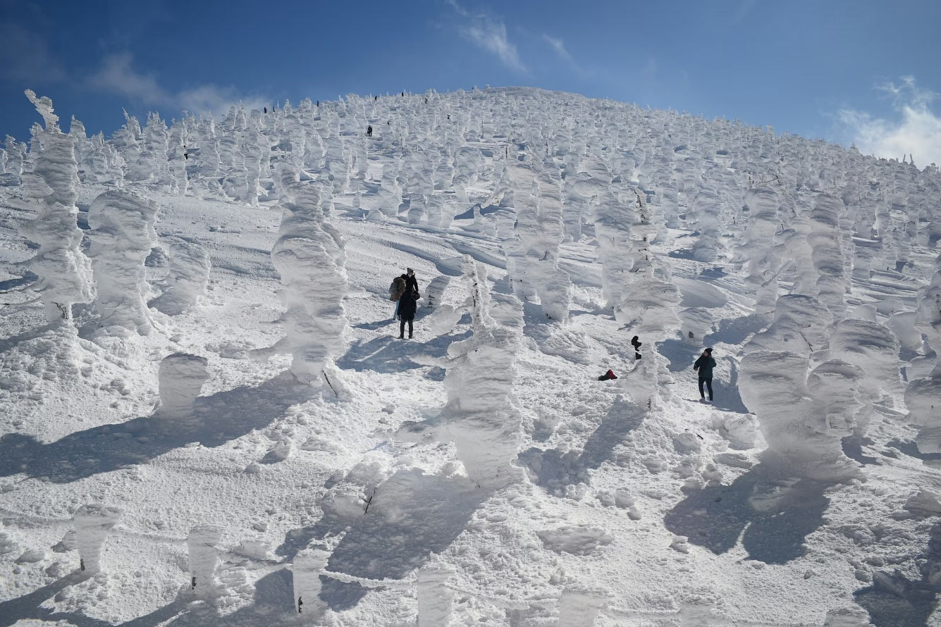 이곳 분화구 호수인 오색호(五色沼)라는 곳이 있고 이 호수의 영향으로 한겨울에는 서리 덮인 나무를 말하는 수빙(樹氷)이 발생하여 장관이라고 합니다.