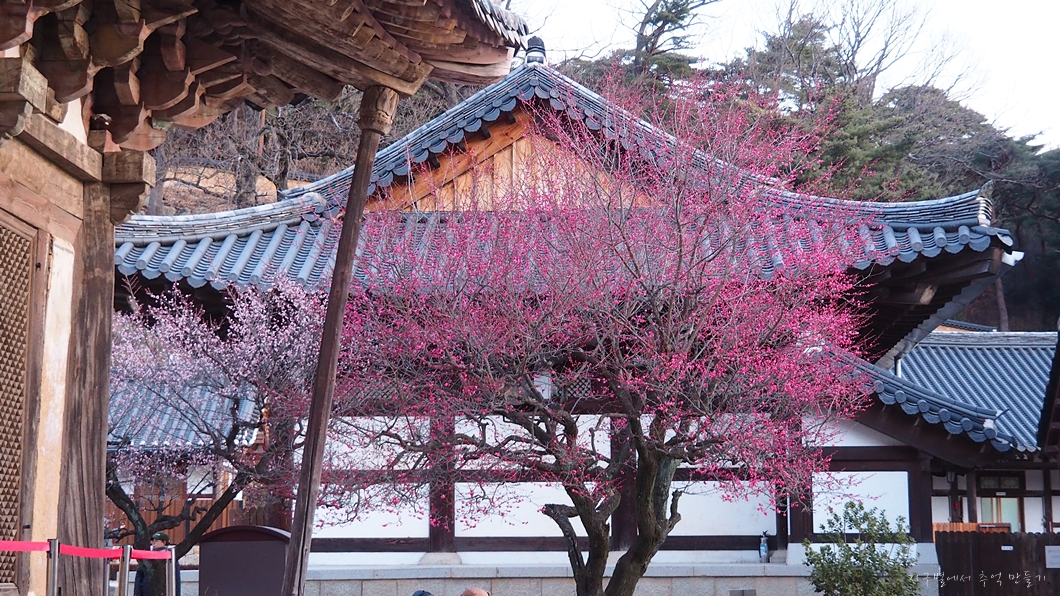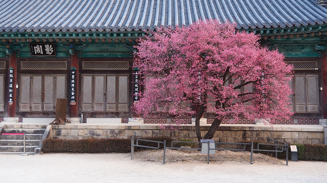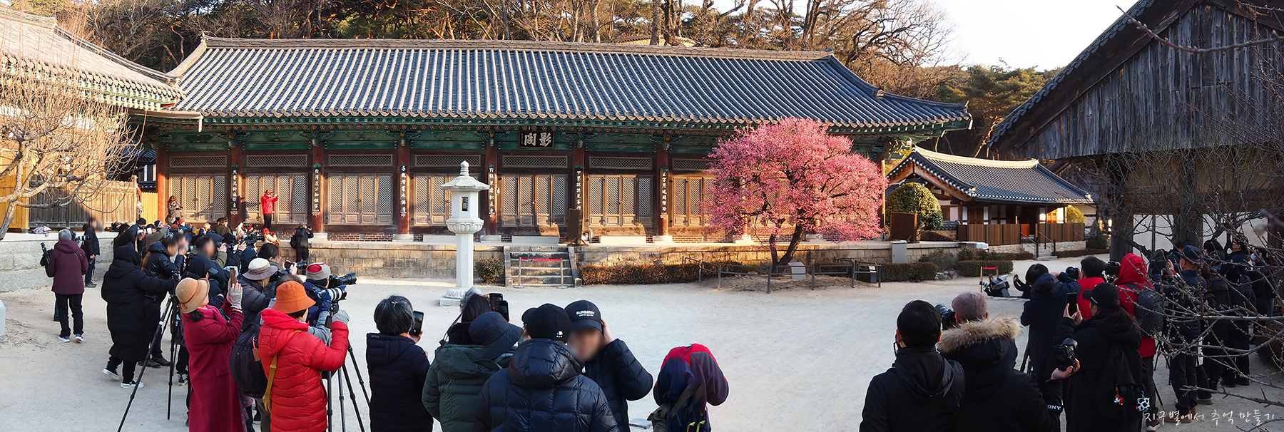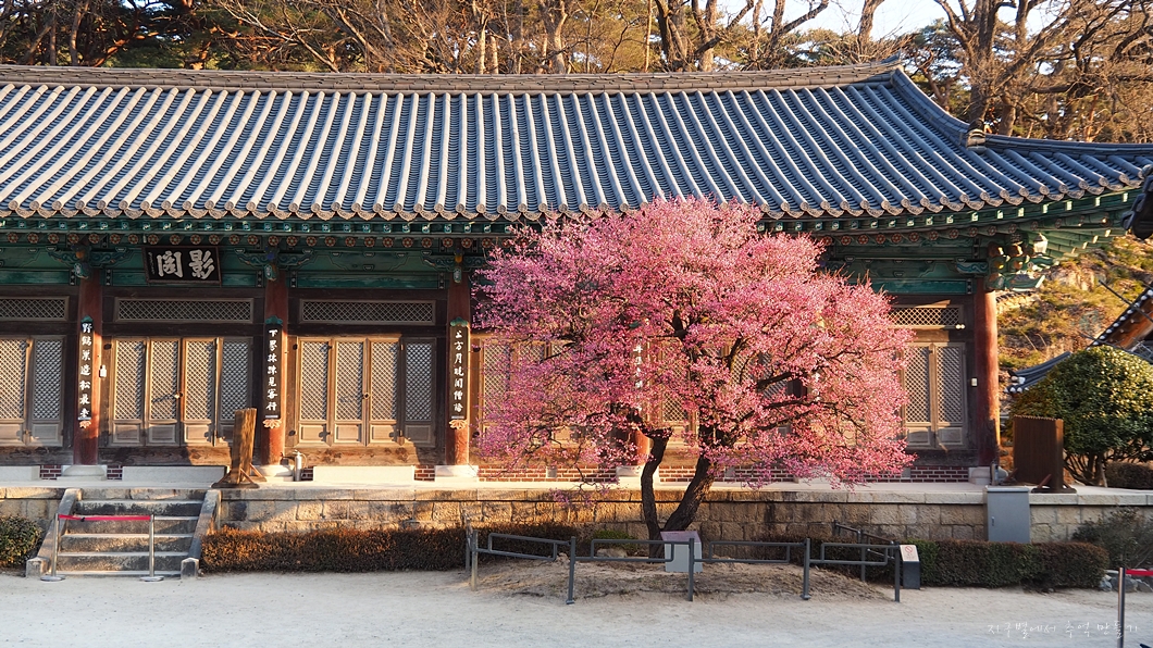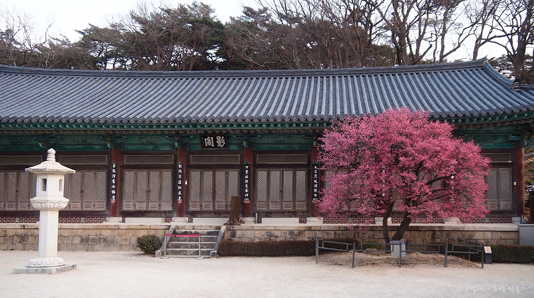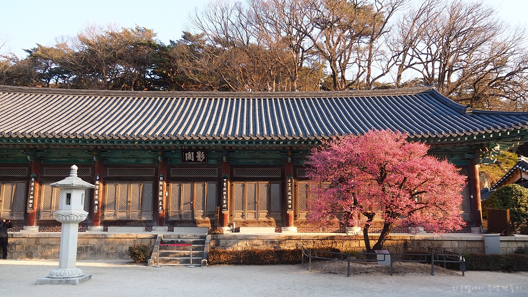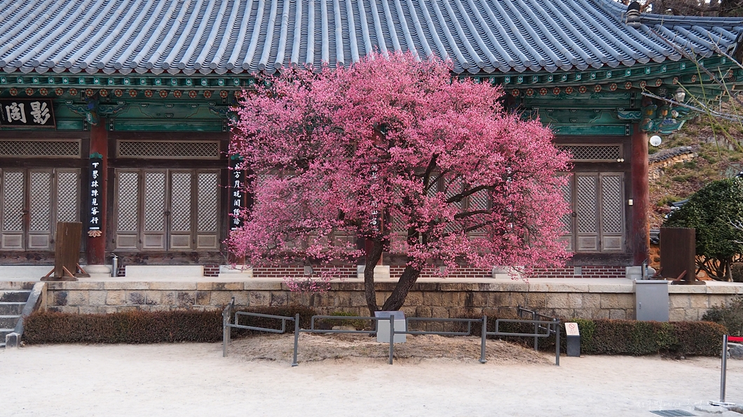 너무나 한적해 보이는 영각 앞의 홍매화...