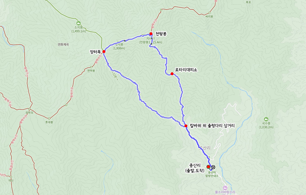 산행 코스 : 중산리 - 칼바위 - 로타리대피소 - 천왕봉 - 장터목 - 중산리(원점회귀)