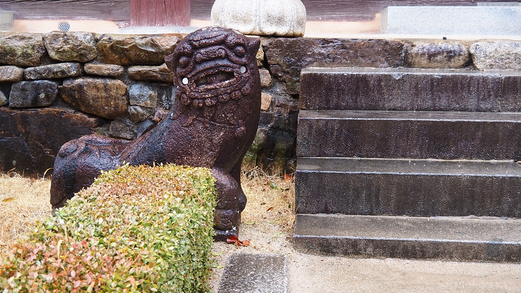 이 해태가 옛날에는 저기 축 위에 얹혀 있었는데 왜 아래로 내려왔는지 모르겠네요. (보기)
