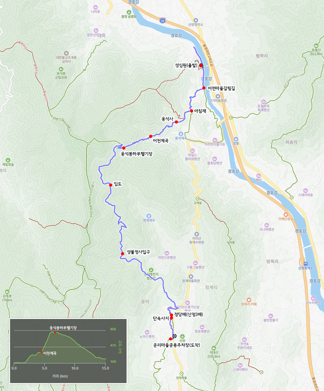 산행 코스 : 성심원 - 아침재 - 어천계곡 - 웅석봉하부헬기장 - 단속사지 - 운리마을 공용주차장(택시 타고 가서 차량 회수)