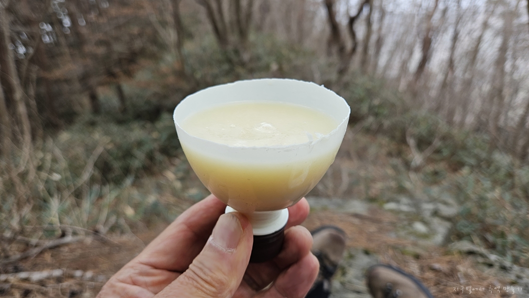 이곳에서 약간 늦은 점심 식사를 하는데 막걸리는 한병 사 왔는데 컵이 없네유..