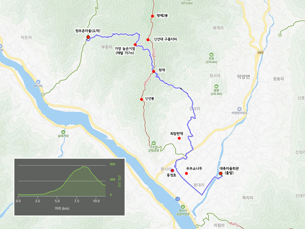 해발 11m에서 출발하여 해발 631m인 윗재를 넘어서고도 계속 올라서 가장 높은 지점인 해발 757m를 넘어가는 구간이구요.