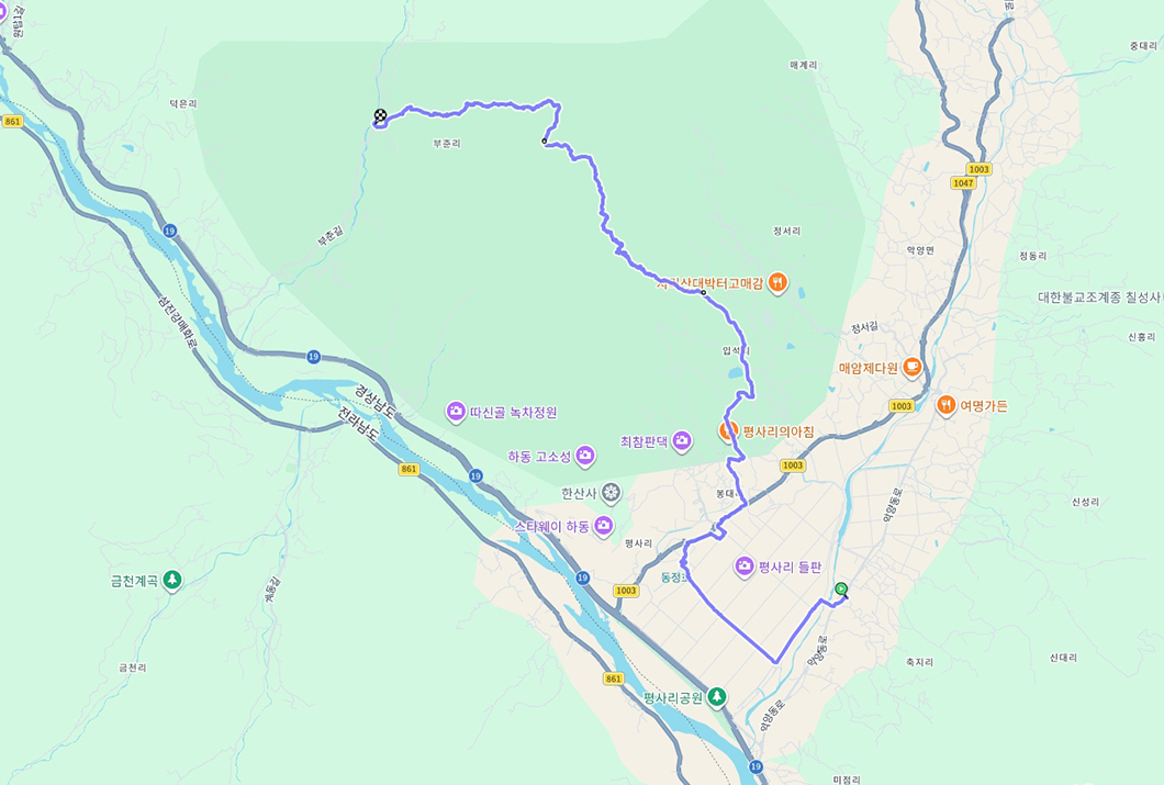 그다음 주욱 내리막 구간으로 이어져 마지막에 원부춘마을에 도착하게 됩니다.