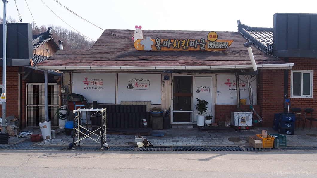 지붕은 통닭이고 아래쪽은 커피집인데 한쪽벽에는 연탄이 가득 쟁여져 있고 반대쪽에는 소주 박스가 가득입니다.