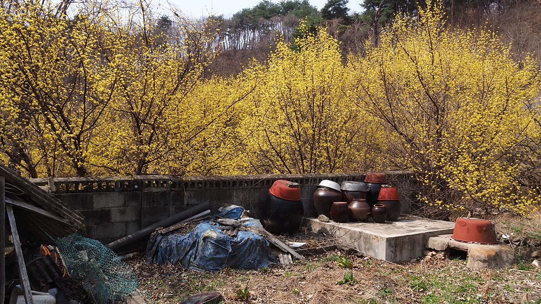 주인 잃은 장독대 뒤에도 무심하게 산수유는 꽃을 피우고 있습니다.