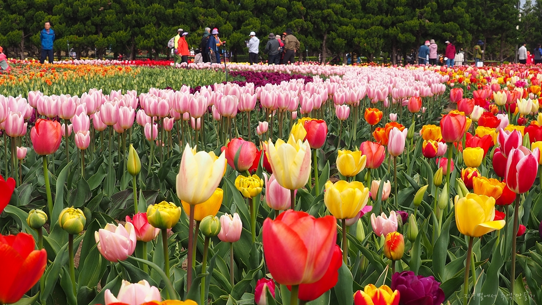 이곳 튤립 꽃밭은 축구장 16개 면적의 압도적인 스케일로 30여 종 100만 송이의 튤립이 이제 막 만개를 했네요.