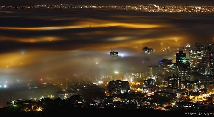 Seasonal fog is illuminated by the lights of Cape Town harbor as the city prepares for the start of winter in the southern hemisphere, on May 8, 2012.