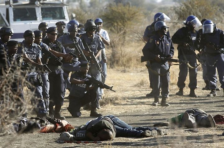 Policemen keep watch over striking miners after they were shot outside a South African mine in Rustenburg, 100 km (62 miles) northwest of Johannesburg, on August 16, 2012. South African police opened fire on thousands of striking miners armed with machetes and sticks at Lonmin's Marikana platinum mine, leaving many bloodied corpses lying on the ground. Police had set up barricades of barbed wire, but were outflanked by an estimated 3,000 miners massed on a rocky outcrop near the mine. A total of 34 miners were killed that day, another 78 wounded.
