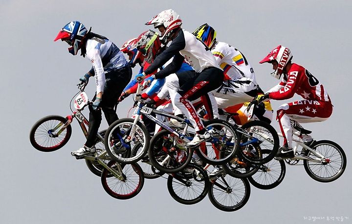 Riders take a jump in the men's BMX quarter-final run at the BMX Track in the Olympic Park, on August 9, 2012.
